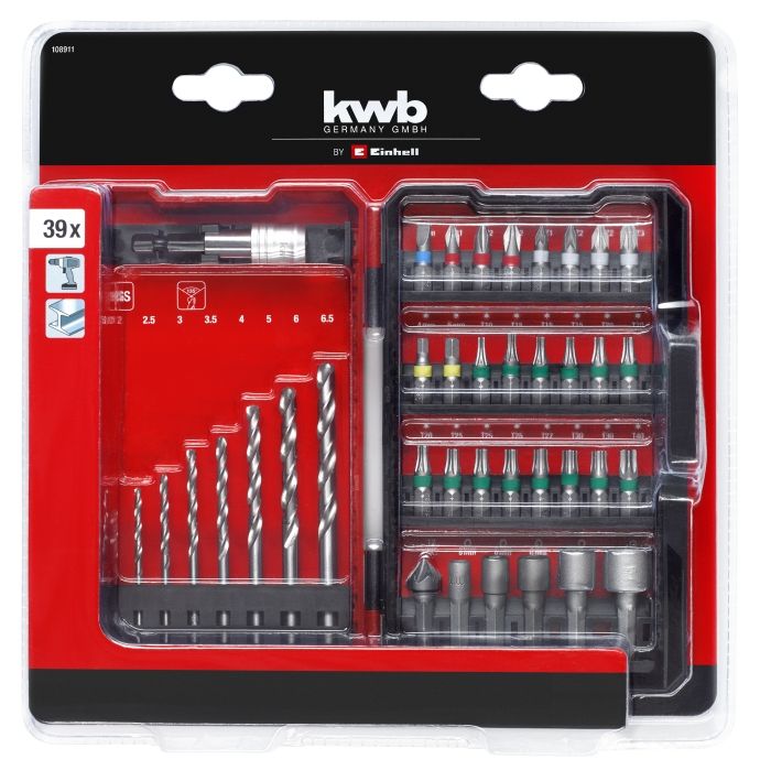 Набір приладдя KWB 39 шт (L-Box): біти PH/PZ/SL/T/HEX, свердла по металу HSS Ø2–6,5 мм (вістря 135°, хвостовик E6.3), гайкові насадки (nut setters) та зенковки. Постачається у зручному пластиковому кейсі. Підходить для шуруповертів і дрилів.