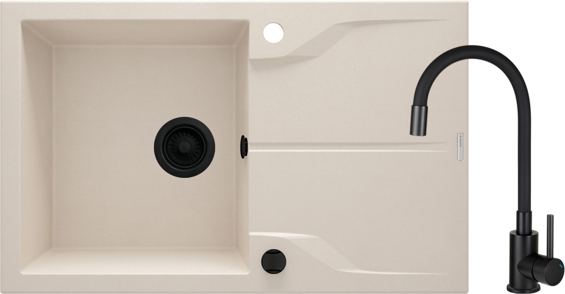 Набір для кухні Andante в бежевому кольорі поєднує стиль і функціональність. Комплект включає гранітну мийку з матовою поверхнею та однокамерним дизайном, з мінімальною шириною шафки 600 мм. Мийка має гідрофобні властивості, компактний сифон Space-Saver і можливість підключення посудомийної чи пральної машини. Змішувач із гнучким носиком забезпечує зручність користування, а його чорне оздоблення додає сучасного вигляду.