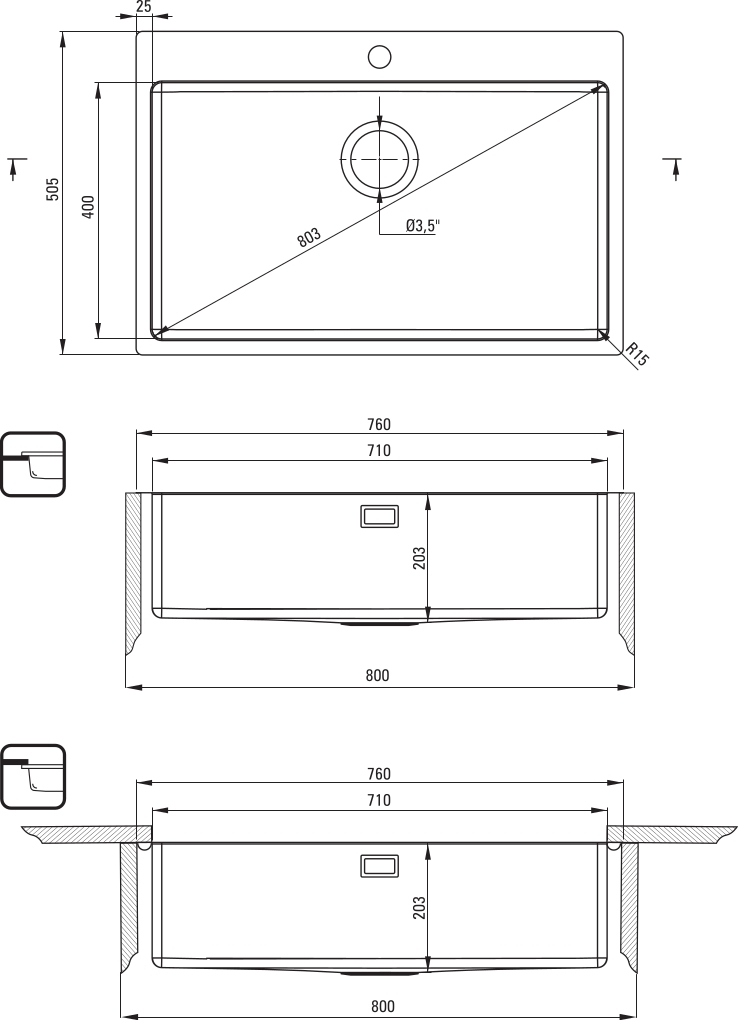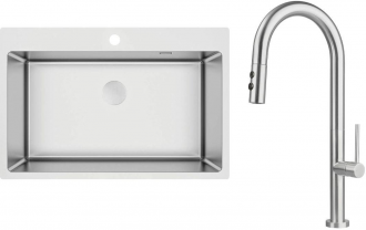 Цей стильний набір ідеально підійде для сучасної кухні, поєднуючи практичність і естетику. Мийка з брашованої сталі 304 має одну глибоку камеру (203 мм) і підтримує врізний, підвісний або монтаж на одному рівні з стільницею. Мінімальна ширина шафки для встановлення — 800 мм. Змішувач з висувним носиком, двома режимами струменя і керамічним картриджем забезпечує легке регулювання витрати води (4–9 л/хв).