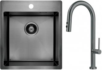 Компактний набір серії Olfato Precious поєднує елегантність і функціональність. Мийка виготовлена з високоякісної нержавіючої сталі з брашованою обробкою в кольорі титан. В комплекті йде компактний сифон Space-Saver із можливістю підключення посудомийної машини. Змішувач із висувним носиком, двома режимами струменя та надійним керамічним картриджем забезпечує комфорт і довговічність. Завдяки сучасному дизайну та виконанню в кольорі титан, набір стане стильним акцентом на будь-якій кухні.