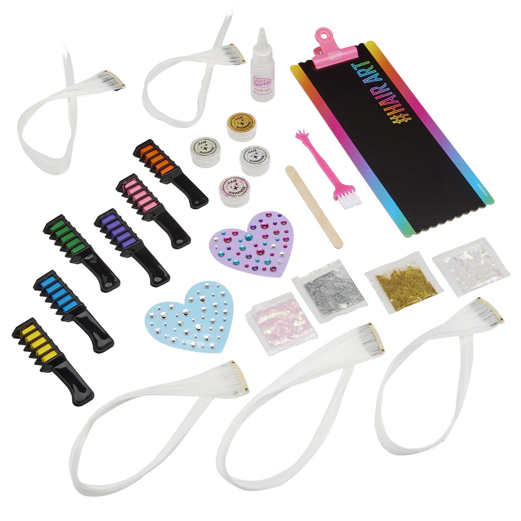 Комплектація:інструкція, 1 пензлик для нанесення, 1 паличка для змішування, 1 гель для волосся з блиском (15 мл), 4 прозорі контейнери з кришками, 6 гребінців із крейдою для волосся (по 4,5 г), 2 пакетики блискіток (по 1 г), 2 пакетики паєток (по 1,5 г), 6 білих накладних пасм із затискачами, 1 дизайнерська дошка, 1 затискач, 2 аркуші декоративних камінців для волосся