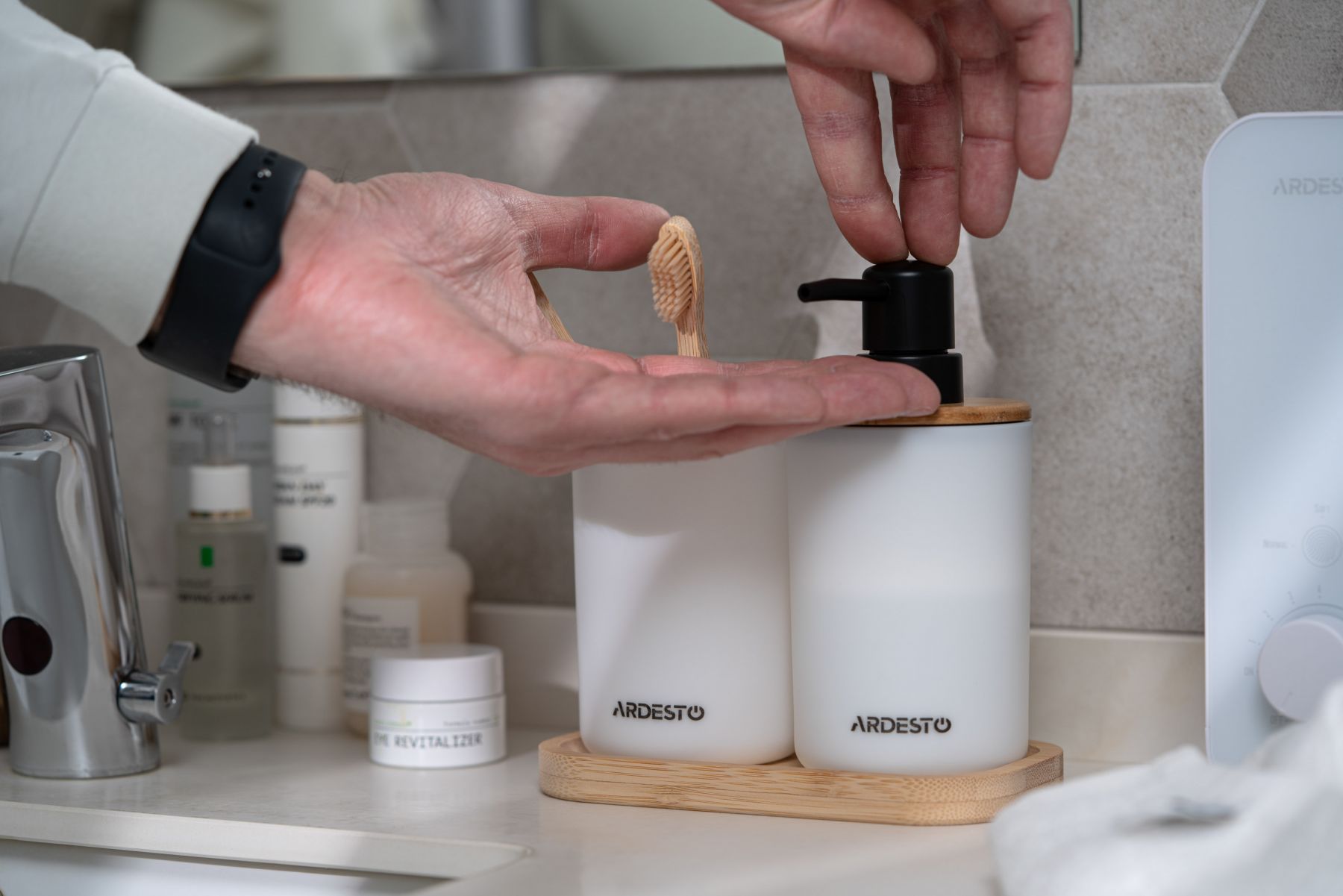 Набір для ванної кімнати ARDESTO Minimalism – це стильне та зручне рішення для щоденного використання. У комплекті: диспенсер для рідкого мила (360 мл), склянка (7,6 × 11 см) та компактна підставка (16,3 × 8,9 × 1,5 см). Білий колір у поєднанні з натуральним бамбуком створює відчуття чистоти та затишку.