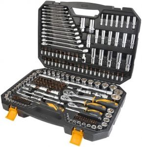 Комплектація:адаптер, подовжувач, головки торцеві, Біти, шарнір, тримач біт, комбіновані ключі, шестигранні ключі, свічний ключ, реверсивна храпова рукоятка, гайкова викрутка, головки подовжені, головки зіркоподібні, головки з бітами