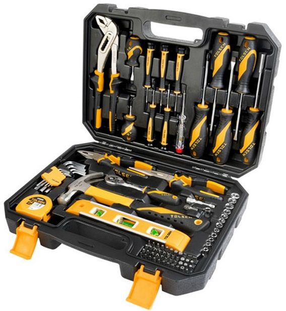 Набір інструментів Tolsen, 89 шт., універсальний 85352, включає в себе широкий асортимент інструментів для різних завдань. У комплект входять реверсивна тріскачка, викрутки різних типів і розмірів, прецизійні викрутки, тестер напруги, набір шестигранних ключів, комбіновані плоскогубці, плоскогубці для водяних насосів, вимірювальна стрічка, молоток, адаптери для біт, біти різних типів, головки, подовжувачі та міні-рівень. Усі інструменти зручно упаковані в корпус видувної форми для легкого зберігання та транспортування.