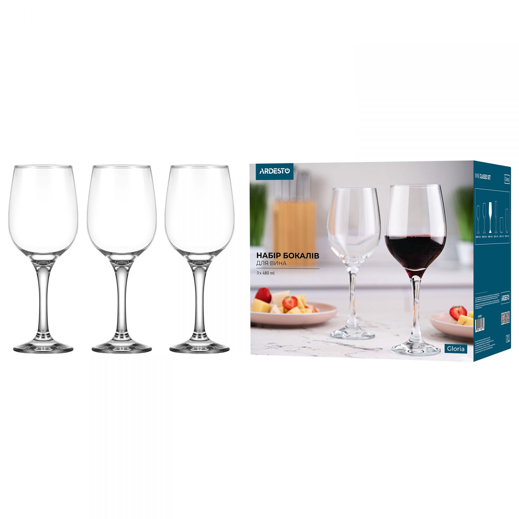 Набір келихів для вина Ardesto Gloria 480мл, 3шт, скло, прозорий