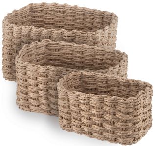 Набір плетених кошиків ARDESTO Prestigio – зручне рішення для зберігання речей у будь-якому приміщенні. У комплектованні є три кошики різного об’єму: 3,3 / 2,2 / 1,4 л. Легкі та практичні кошики виготовлені з паперового шпагату й мають привабливу плетену текстуру. Насичений бежевий колір додає універсальності, а компактний розмір дає змогу зручно організувати простір у шафі, на полиці чи відкритій поверхні.