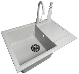 Кухонний набір Adamant Horizon Medium поєднує простору прямокутну мийку зі штучного каменю, змішувач та зручний дозатор. Глибока чаша та широке крило надають комфорт під час миття й підготовки продуктів. Матова поверхня зберігає охайний вигляд і легко очищується. Технологія Solid Surface забезпечує високу міцність та стійкість до впливів. Це універсальне рішення для сучасного та функціонального кухонного простору.
