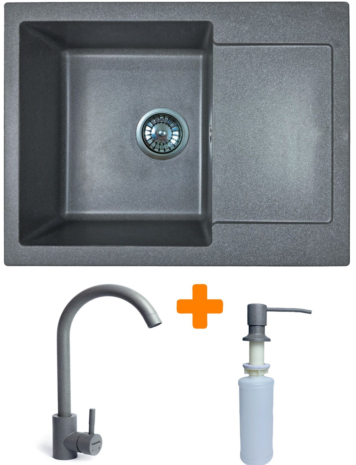 Набір кухонний Adamant Minimal, штучний камінь, прямокут., з крилом, 615х495х200мм, чаша - 1, врізна, сірий + змішувач та дозатор