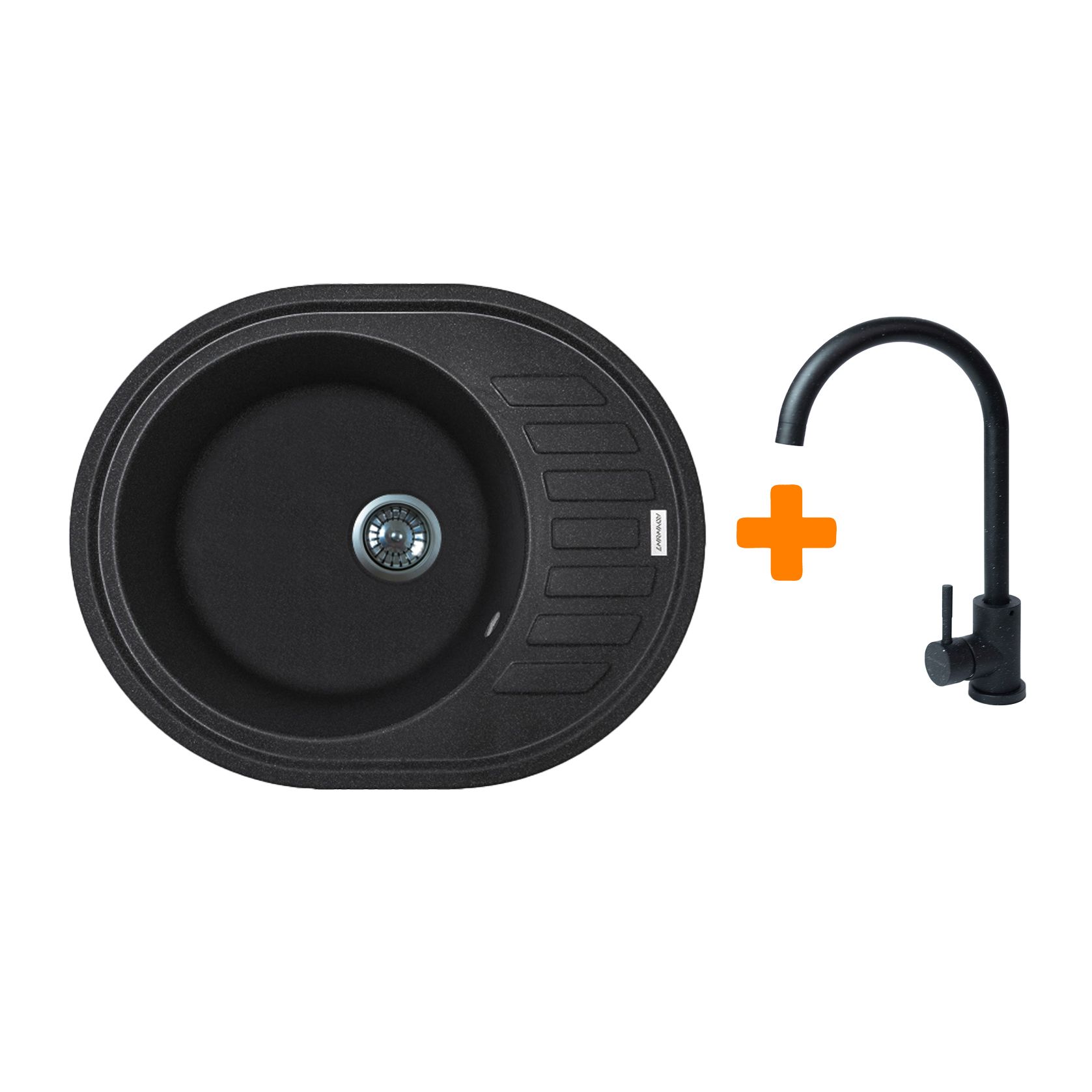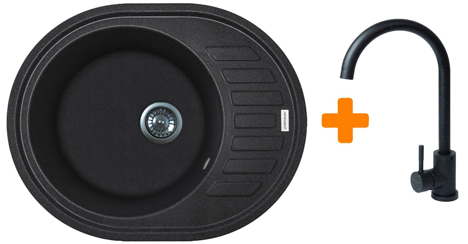 Набір кухонний Adamant Ovum, штучний камінь, овальна, з крилом, 615х495х200мм, чаша - 1, врізна, чорний + змішувач