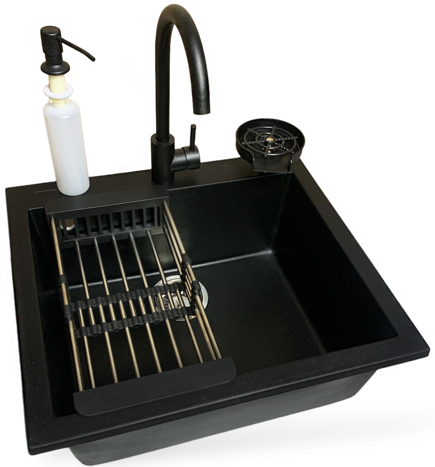 Набір кухонний Adamant Univer, штучний камінь, квадрат, без крила, 560х500х200мм, чаша - 1, врізна, антрацит + змішувач + дозатор + ополіскувач склянок + коландер