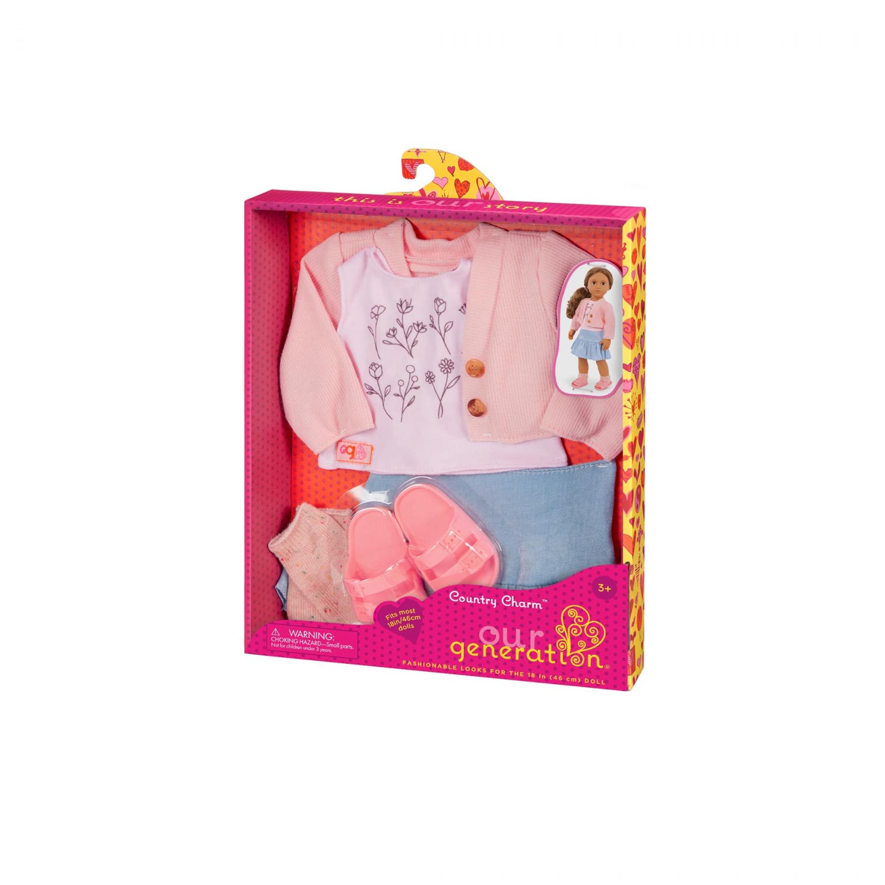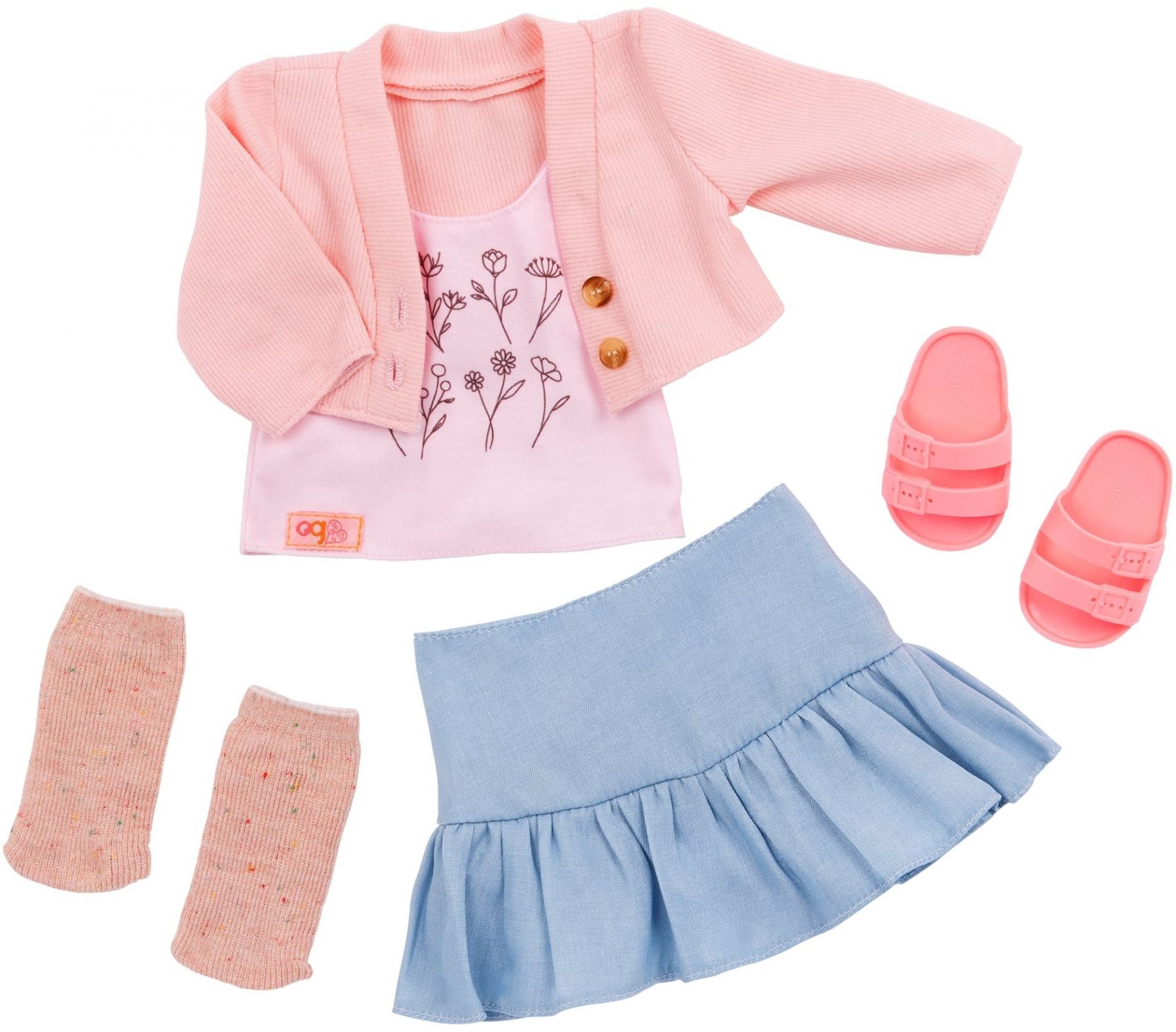 Подаруйте своїй ляльці стильний та ніжний образ із набором повсякденного одягу в ніжних кольорах від Our Generation! Цей комплект створений спеціально для ляльок заввишки 46 см, щоб зробити кожну прогулянку особливою. Рожева кофтинка на ґудзиках, плісирована блакитна спідниця, легкий топ із квітковим принтом, а також шкарпетки й стильні сандалі — усе, що потрібно для чарівного весняно-літнього образу.
