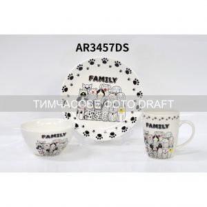 Набір посуду ARDESTO серії Family поєднує стиль і та практичність. Дизайн у білому кольорі з зображенням кумедних песиків поліпшує настрій і додає позитиву. У наборі 3 предмети: чашка об’ємом 320 мл, піала об’ємом 450 мл і тарілка діаметром 21 см. Посуд виготовлено з якісної порцеляни, міцної та стійкої до утворення сколів і тріщин, що зумовлює тривалий термін слугування. Вироби можна використовувати в мікрохвильовій печі та мити в посудомийній машині. Набір буде вдалим подарунком для близьких і друзів.