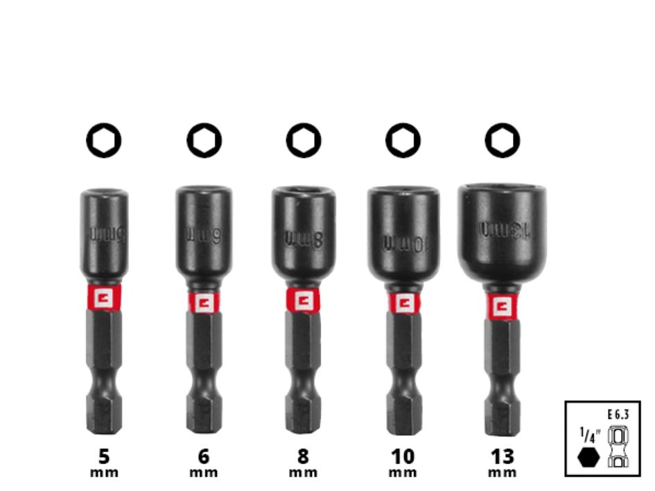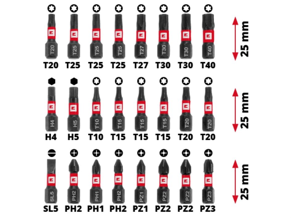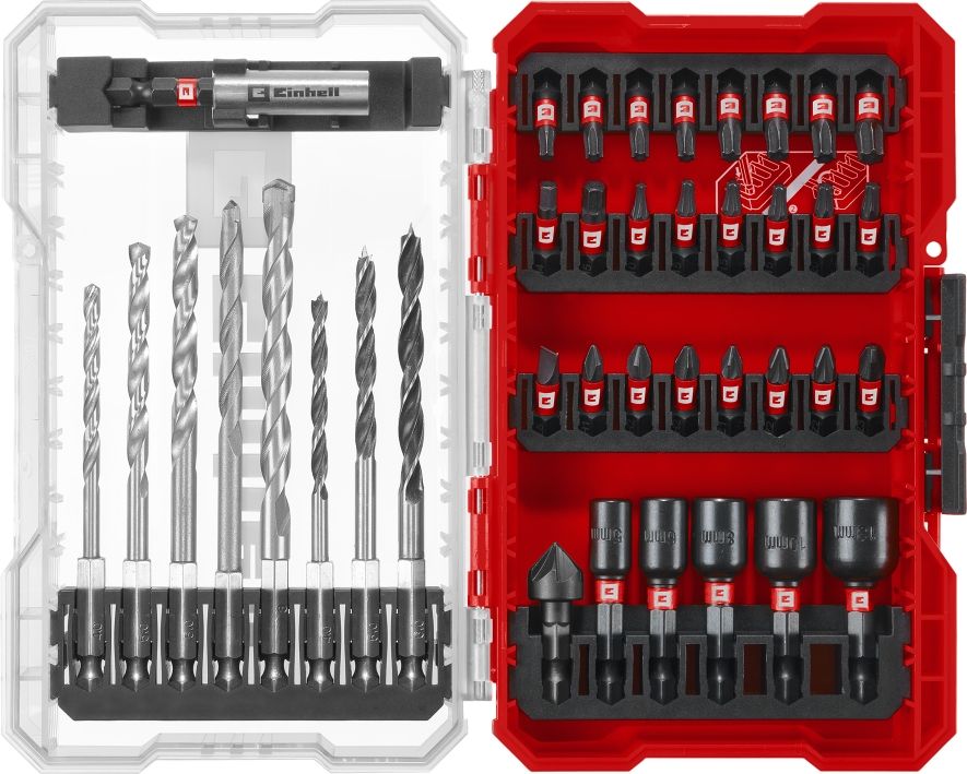 Einhell M-Case (39 од.) — набір для шуруповертів і дрилів: 24 біти 25 мм (C6.3; PH/PZ/SL/T/H; сталь S2, марганцево-фосфатована), 3 свердла по металу HSS 4/5/6 мм (E6.3), 3 по дереву C45 4/5/6 мм, 2 по каменю 6/8 мм, 5 торцевих головок 5–13 мм та магнітний бітотримач. Усе в міцному кейсі з прозорою кришкою та автофіксацією.