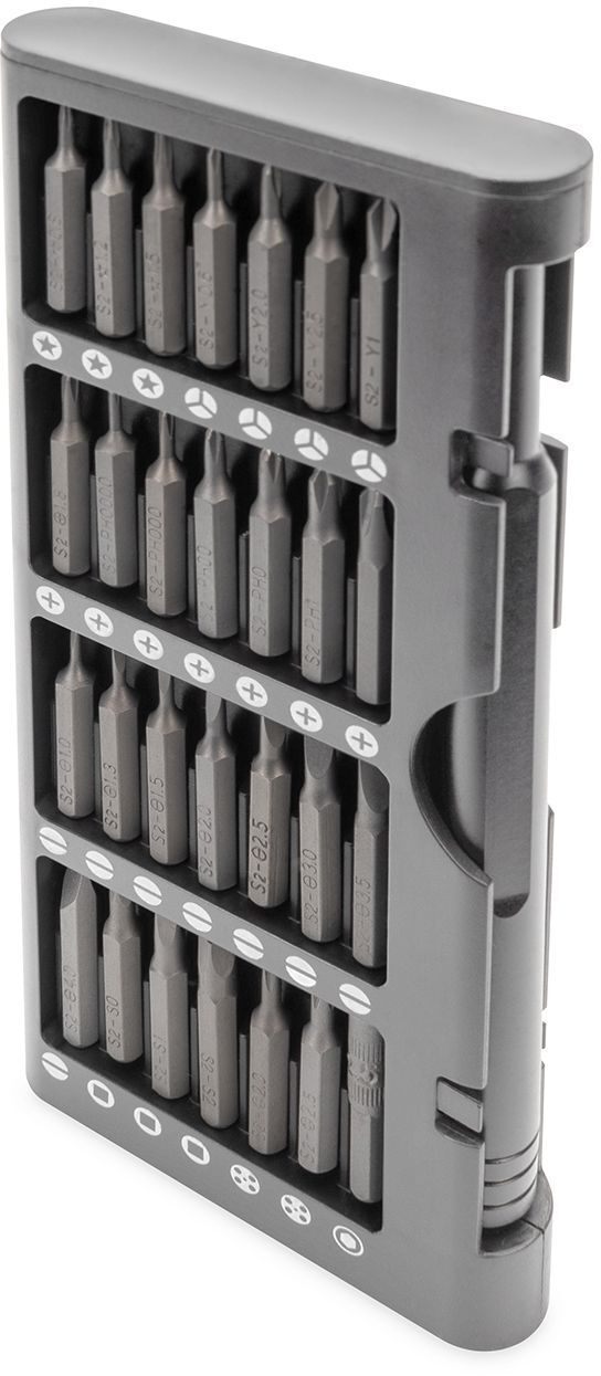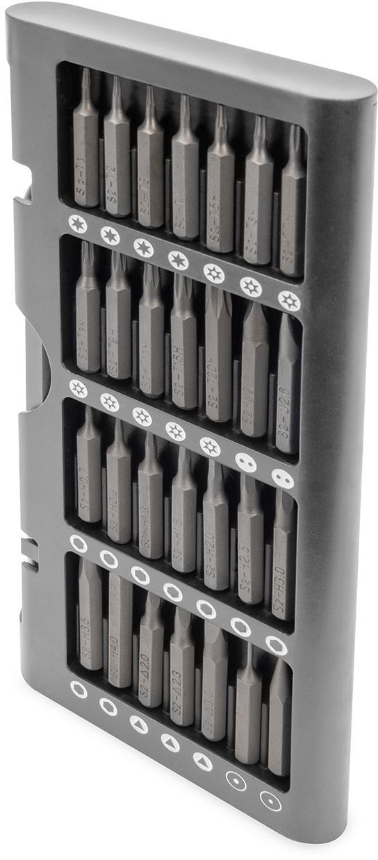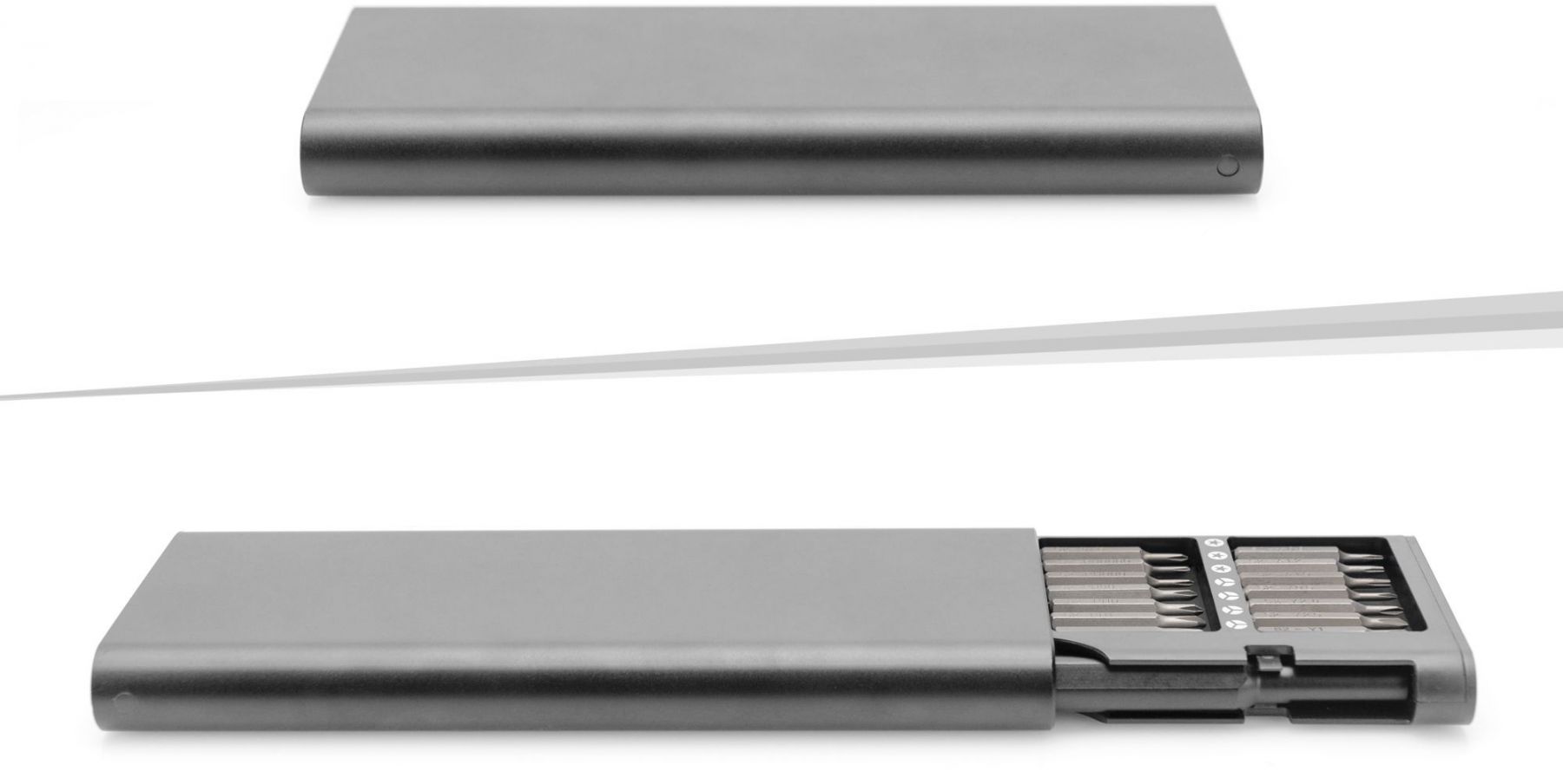 Набір інструментів DIGITUS містить великий вибір насадок для викруток і поставляється в зручній алюмінієвій коробці, яку легко транспортувати та швидко готувати до використання. Наконечники викрутки виготовлені з високоякісної інструментальної сталі S2, тому міцні та довговічні. Зокрема, для ремонту смартфонів, встановлення комп’ютерних аксесуарів або для виготовлення моделей завжди доступна відповідна насадка для викрутки.