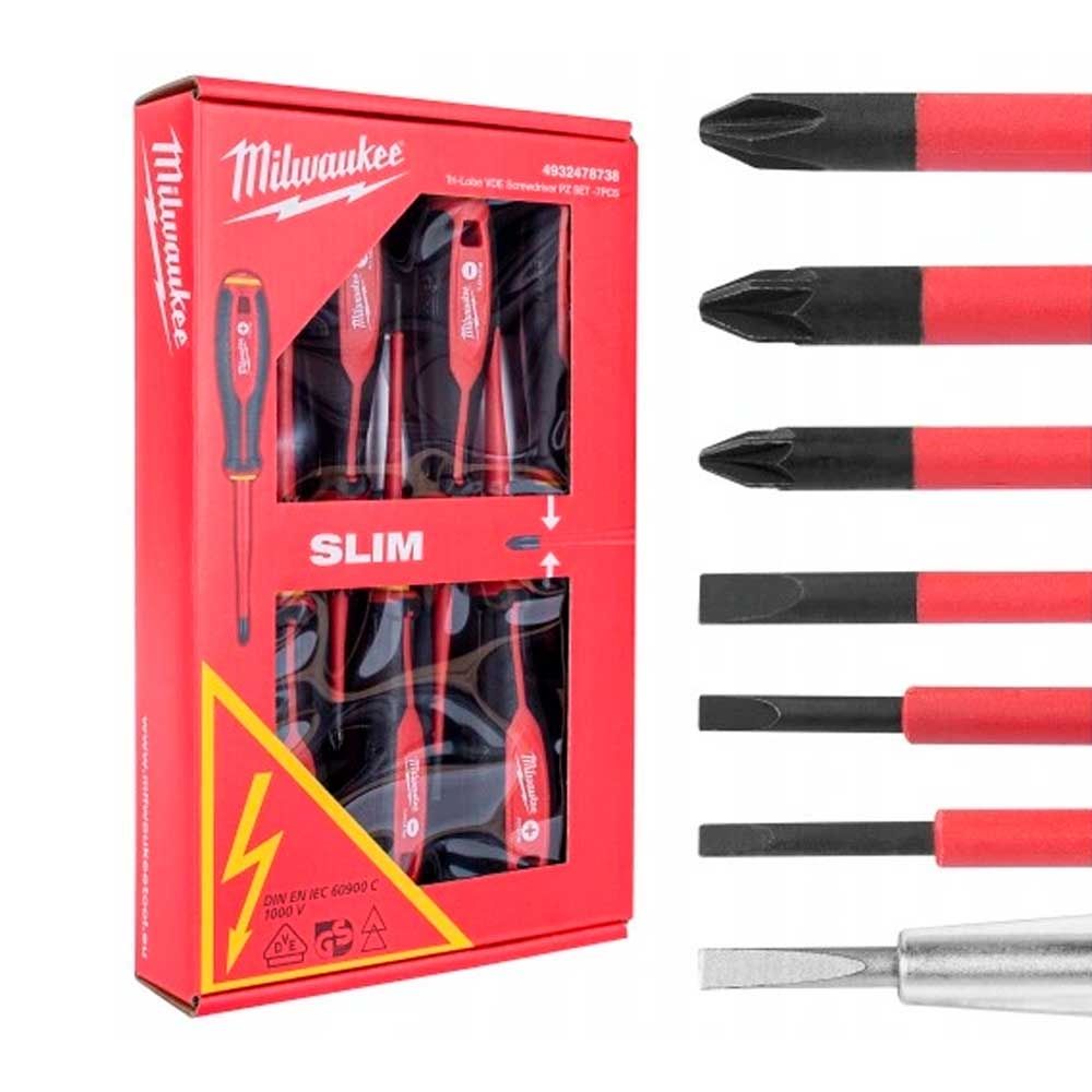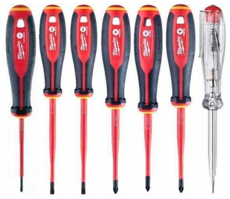 Набір викруток ізольованих Milwaukee до 1000В SL2,5,SL3,SL4,PH2,PZ1,PZ2,викрутка-тестер 7шт