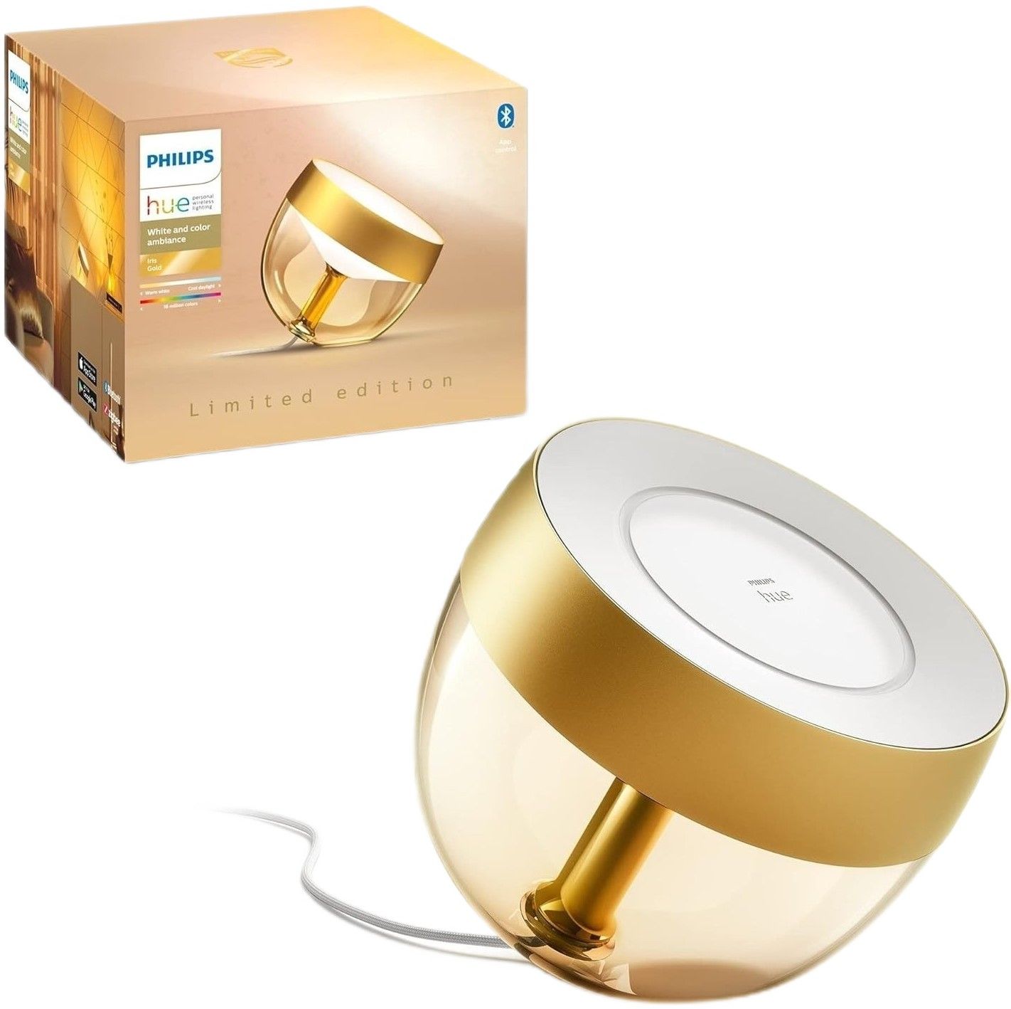 Створіть настрій в будь-якій кімнаті вашого будинку зі стильним світильником Philips Hue Iris золотого кольору. Завдяки світлу, який одночасно розфарбовує стіну і забезпечує м'яке підсвічування, світильник Iris створює вишуканий і унікальний ефект. Додайте блок управління Hue Bridge, щоб скористатися повним набором функцій розумного освітлення