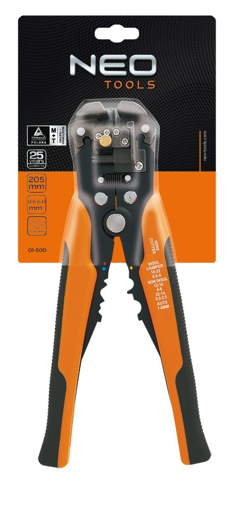 Автоматичний знімач ізоляції NEO TOOLS торцевий, розмір 205 мм. Служить для зняття ізоляції й обтиску наконечників на провід 22-10 AWG. Робочий діапазон від 0.2 до 6 мм2, для обтиску наконечників від 1.5 до 6 мм2. Губки виготовлені з надзвичайно міцної сталі з твердістю 52 - 57 HRC, що забезпечує довголітню міцність інструменту. Двокомпонентні, ергономічні рукоятки підвищують комфорт роботи. Якість інструменту підтверджено сертифікатом TÜV і 25-річною гарантією виробника. Бренд NEO TOOLS виправдовує очікування професіоналів.