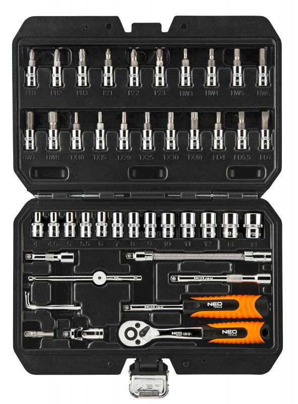 Набір торцевих ключів 1/4 "NEO, складається з 46 предметів, виготовлених з високоякісної хромованадіевой сталi. До складу набору входить тріскачка з міцним храповим механізмом (72 зубців). У наборі багатий асортимент змінних головок (розміри від 4 до 14 мм) і наконечників (шліцьові, хрестові, шестигранні, Torx). Додатково в наборі є подовжувачі (в тому числі гнучкий), універсальний шарнір, шестигранні ключі, Т-подібний комірець і утримувач для змінних наконечників. Набір упакований в зручний кейс.