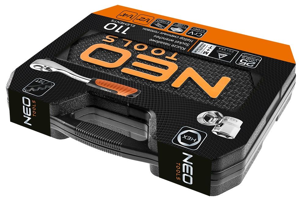 Набір торцевих ключів 1/2" і 1/4" NEO, складається з 110 предметів, виготовлених з високоякісної хромованадієвої сталi. До складу набору входять тріскачки 1/2" і 1/4". У наборі багатий асортимент змінних головок (розміри від 4 до 32 мм) і наконечників (шліцьові, хрестові, шестигранні, Torx). Додатково в наборі є велика кількість аксесуарів. Набір упакований в зручний кейс.