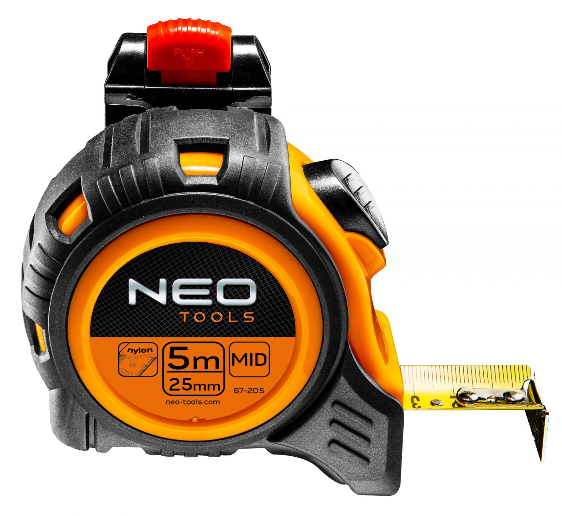 Рулетка NEO, сталева стрічка, 5 м x 25 мм, з фіксатором selflock, кріплення на пояс