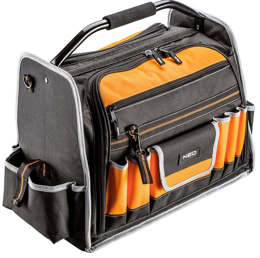 Дно кофра зміцнено стійками, що захищають вміст під час роботи у важких умовах. Кофр з міцною ручкою і плечовим ременем. Особливість кофра - це велика кількість кишень - 12 зовнішніх і 32 внутрішніх. Бренд Neo Tools виправдовує очікування професіоналів.