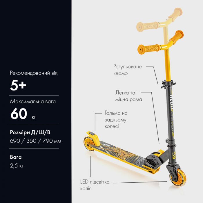 Особливості:висота керма регулюється, складна конструкція, міцна і легка рама, неонові колеса, міцна алюмінієва дека
