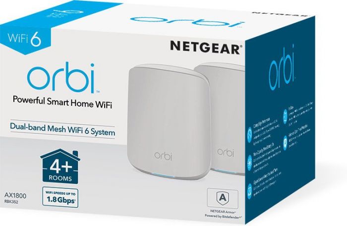 Дводіапазонна WiFi-система NETGEAR Orbi RBK352 складається з високошвидкісного продуктивного маршрутизатора і одного сателіта. Потужна ячеиста система з технологією Wi-Fi6, Mesh Orbi і 4-ма просторовими потоками передачі даних забезпечить покриття будинку надійною бездротовою мережею площею до 200 кв.м., швидким Wi-Fi-сигналом з максимально можливою швидкістю підключення до 1,8 Гбіт /с для стабільної потокової передачі даних стандарту 4К / 8К UHD, відеоконференцій, онлайн ігор, резервного копіювання та зберігання даних.