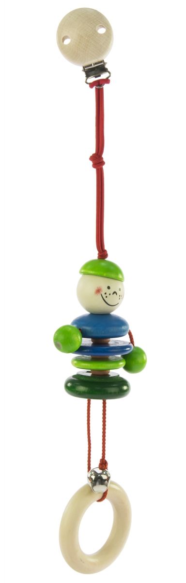 Екологічне брязкальце на кліпсі «Карлі» німецького виробника іграшок nic для дітей від 3-х місяців. Цей аксесуар надійно чіпляється на ліжечко або коляску найменших. Він постачається разом із міцною фірмовою картонкою, на якій закріплена кліпса. Вона вироблена із дерев’яних елементів у натуральних, блакитних та зелених кольорах, гнучких червоних гумок, червоного текстильного шнурка, металевого дзвіночка та надійної металевої кліпси. Дерев’яні елементи оброблені дуже якісно, вони вкриті фарбами на водній основі. Метал, з якого зроблений дзвіночок і кліпса, гіпоалергенний - весь аксесуар в цілому безпечний для здоров’я дитини.