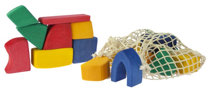 Різноманітний світ кольорів та форм втілений у дерев’яному наборі із дерев’яних брусків німецького виробника іграшок nic. Усі 17 деталей зав’язані у текстильну сітку, яку можна використовувати для зручного зберігання конструктора або інших іграшок. Матеріал, з якого вироблений набір – натуральне дерево, вкрите матовими фарбами на водній основі. Фарби чудово підкреслюють малюнок дерева на сторонах брусків. Деталі великі, але легкі, вони приємні на дотик і якісно оброблені.