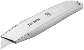 Ніж інструментальний Tolsen призначений для різання паперу, шпалер, плівки, скотча, монтажної піни, ковроліну, гіпсокартону. Ріжучий інструмент характеризується високим ступенем безпеки і застосовується на складах, будівництвах, при виконанні домашніх та офісних робіт.