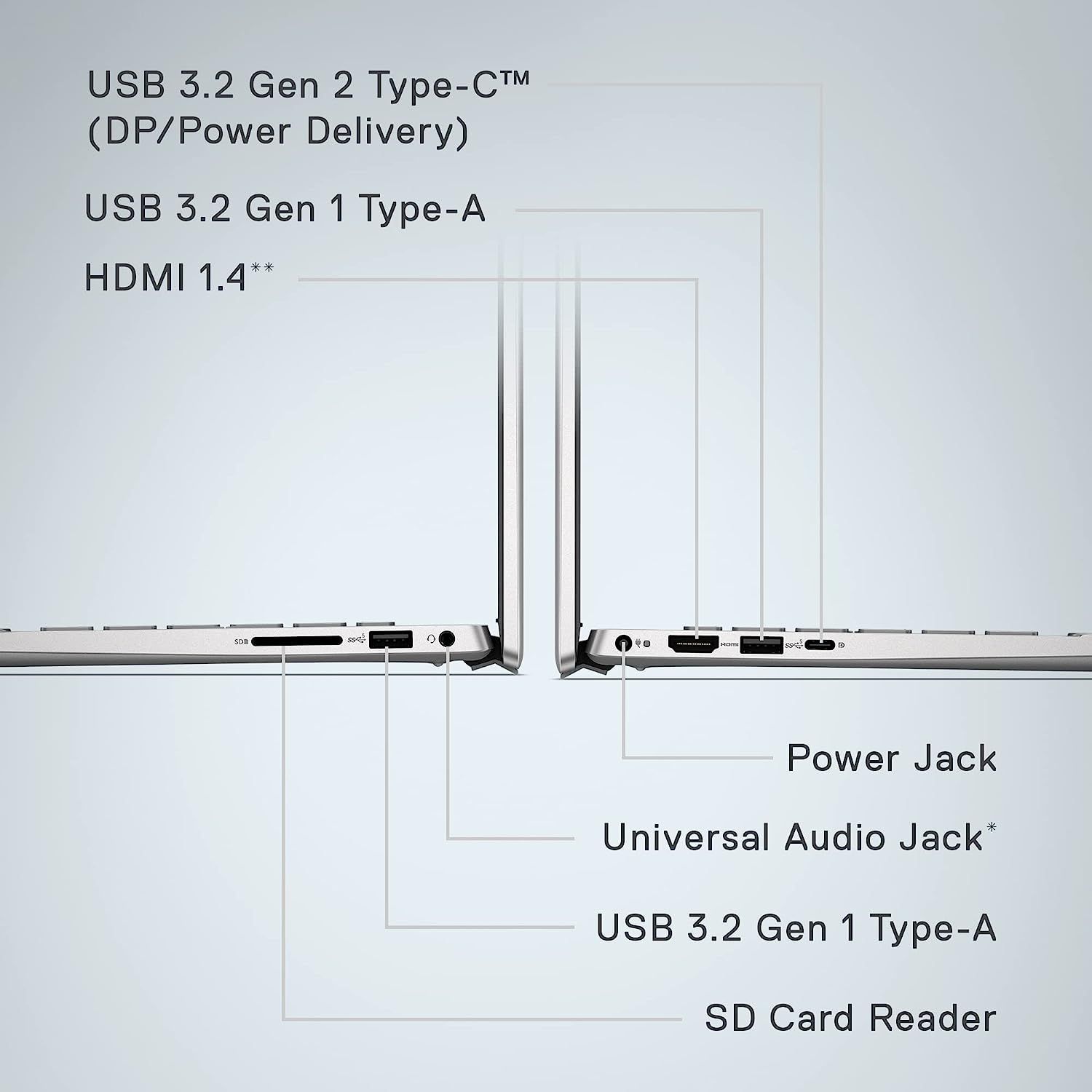 Роз'єми і порти введення-виведення:1 x HDMI 1.4, 1 x Audio Jack, SD Card Reader, (1) USB 3.2 Gen 2 Type-C (DP/PowerDelivery), (2) USB 3.2 Gen 1 Type A