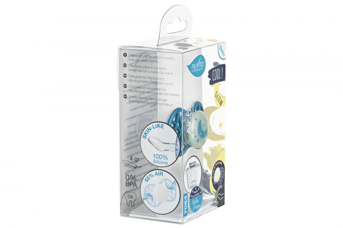 Ортодонтична пустушка Air55 Cool, яка світитися в темряві. Платівка соски на 55% складається з повітря забезпечуючи майже повну аерацію області навколо рота, уникаючи скупчення слини, яка може дратувати шкіру. Захисний ковпачок для соски для підтримки чистоти соски і стерилізації в мікрохвильовій печі простим додаванням води.