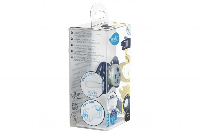 Симетрична пустушка Air55 Cool, яка світитися в темряві. Платівка соски на 55% складається з повітря забезпечуючи майже повну аерацію області навколо рота, уникаючи скупчення слини, яка може дратувати шкіру. Захисний ковпачок для соски для підтримки чистоти соски і стерилізації в мікрохвильовій печі простим додаванням води.