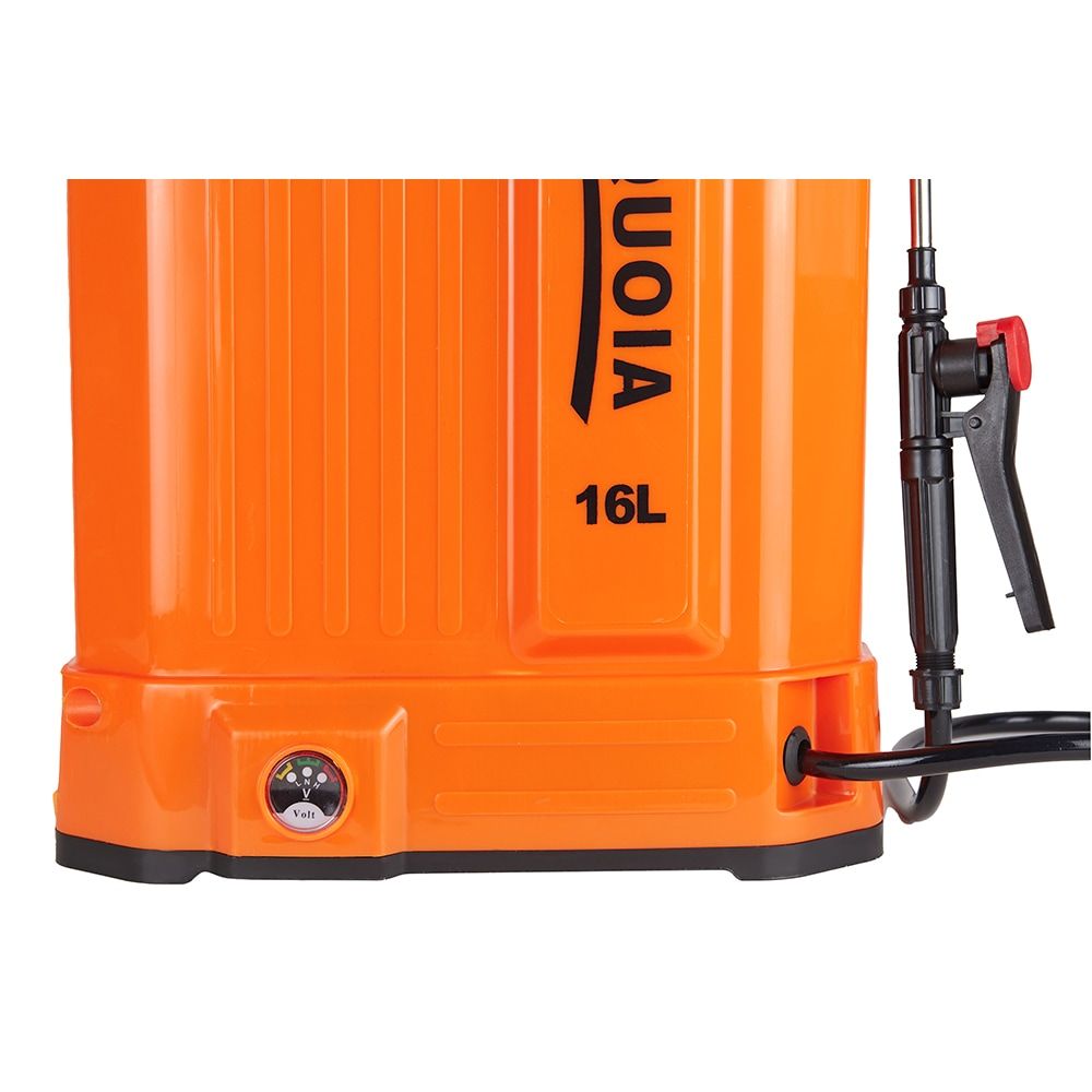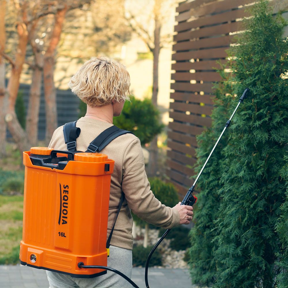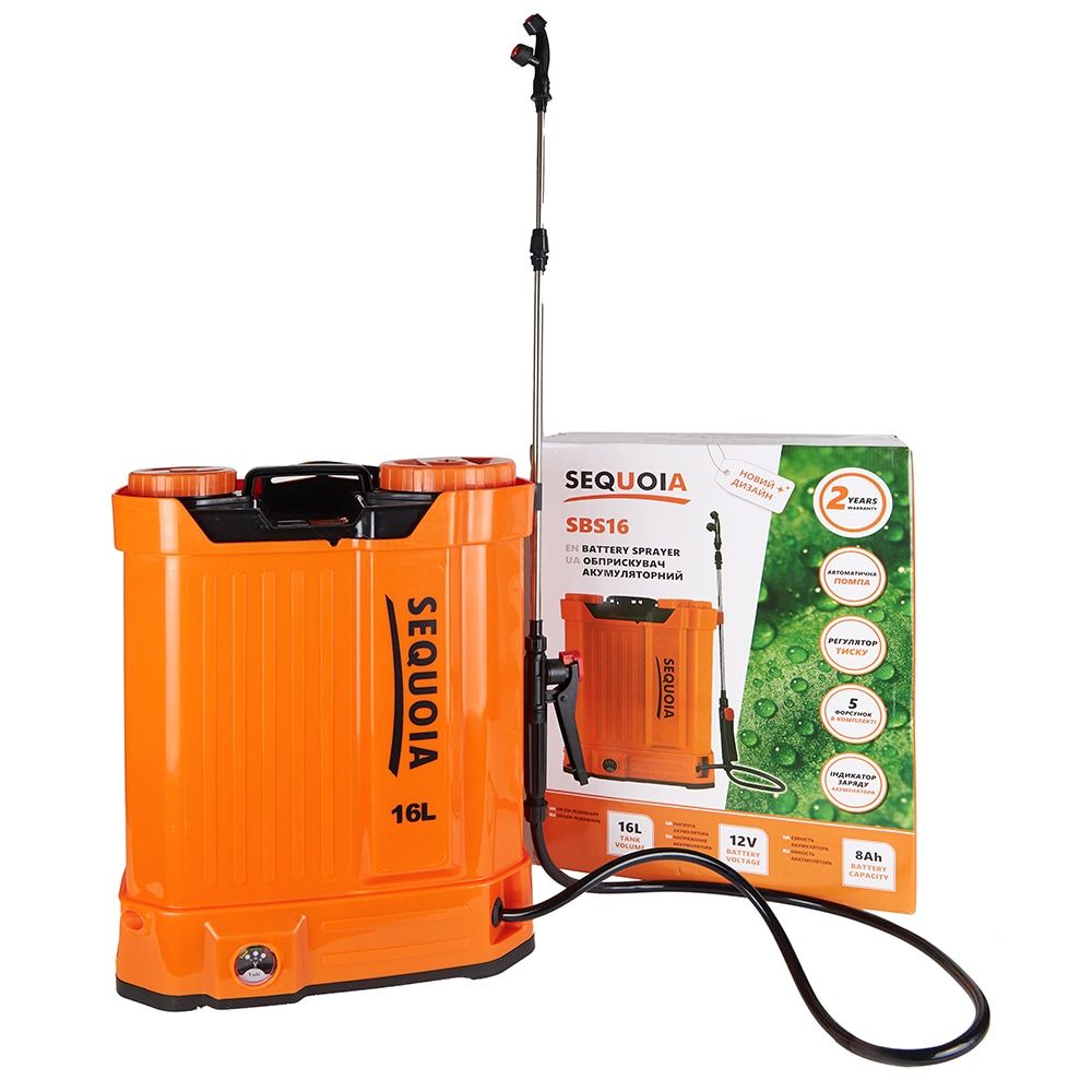 SEQUOIA SBS16 — акумуляторний обприскувач 16 л з тиском до 5 бар. Акумулятор 12 В 8 А·год дозволяє працювати 3–6 годин без підзарядки. Рівномірне розпилення, регульована насадка та зручні лямки роблять обробку комфортною. Підходить для садів, городів, теплиць та виноградників. Вага 5 кг (порожній) — оптимальне співвідношення об’єму та зручності.