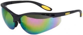 Захисні окуляри DeWALT Reinforcer DPG58-6D з кольоровими (вогненно-дзеркальними) полікарбонатними лінзами забезпечують захист від ударів та УФ-променів (99,9% UVA/UVB). Лінзи з твердим покриттям стійкі до подряпин, а м'які гумові насадки на дужках та носоупорі додають комфорту для тривалого носіння. Оправа з нейлону з антиковзким покриттям полегшує посадку на шолом. Цей виріб пасує до робіт з яскравим освітленням у будівництві та ремонті.