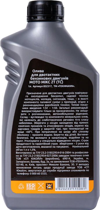 Мінеральна моторна олива Tekhmann призначена для систем змащування двотактних двигунів з повітряним охолодженням сучасних бензопил та бензотримерів. Застосовується в якості компоненту паливно-мастильної суміші в пропорції 1:32 – 1:50 згідно рекомендацій виробників техніки.
