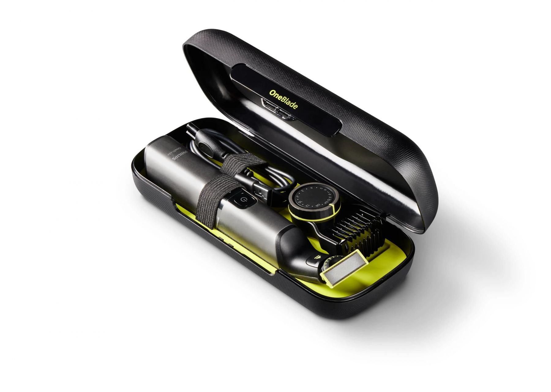 OneBlade Travel Case — твердий дорожній футляр для безпечного зберігання пристрою Philips OneBlade. Передбачене місце для ручки з установленим лезом, зарядного кабелю USB-A та одного гребінця. Твердий корпус забезпечує захист пристрою під час транспортування та зберігання.