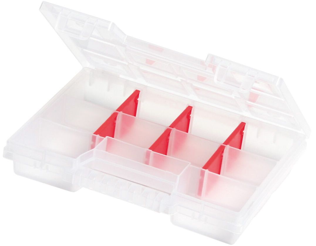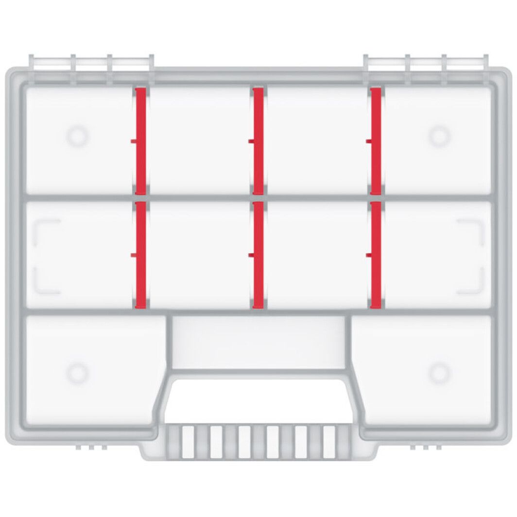 Компактний органайзер Kistenberg NORT 20 (19.5x15.5x3.5 см) із 6 знімними перегородками забезпечує зручне зберігання дрібних інструментів і деталей. Прозора кришка з поліпропілену дозволяє легко переглядати вміст. Міцні засувки забезпечують надійне закриття, а ергономічна ручка додає зручності при транспортуванні.