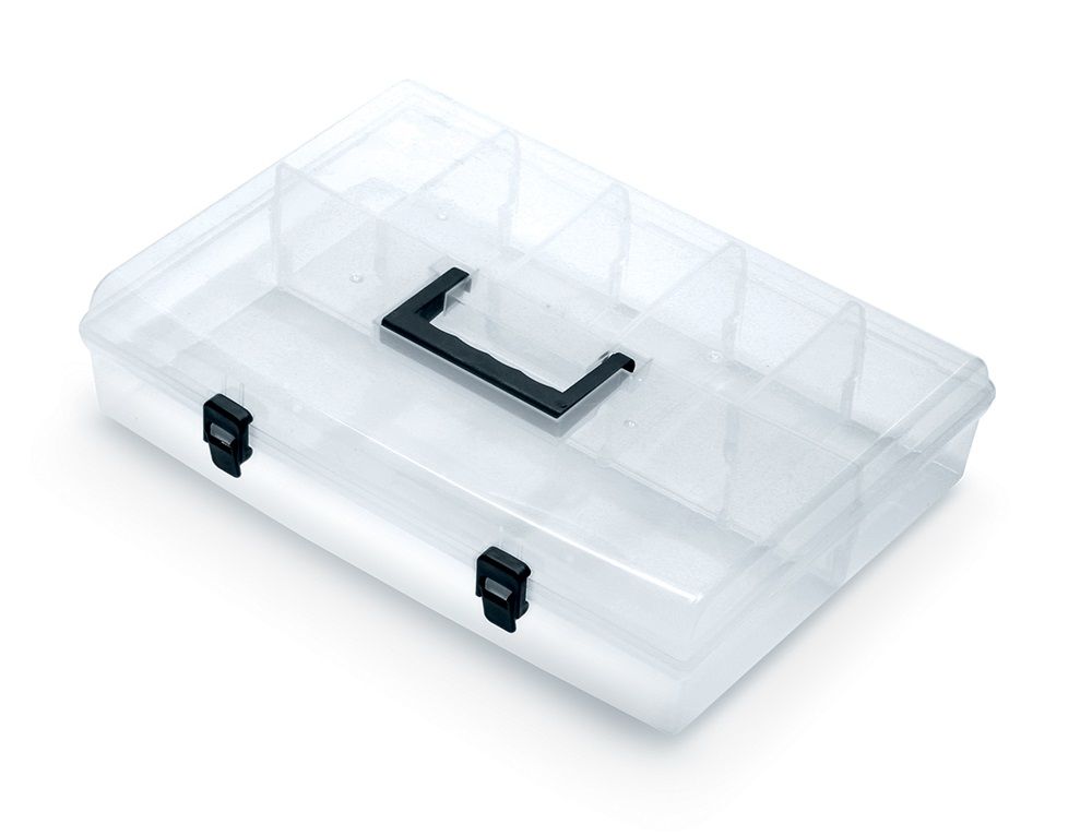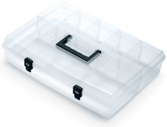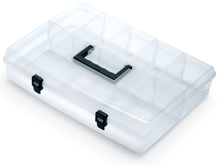 Місткий органайзер розміром 40x29.8x8.5 см із 5 фіксованими відділеннями. Кришка та корпус виготовлені з прозорого поліпропілену для швидкого огляду вмісту. Оснащений ергономічною ручкою у кришці для зручного транспортування та міцними засувками для надійного зберігання.