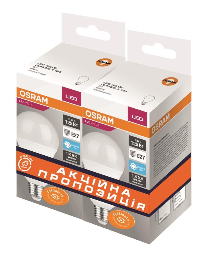 Набір світлодіодних ламп OSRAM 2шт/уп. 13ВТ 4000К Е27 (аналог 125ВТ, 1200Лм)