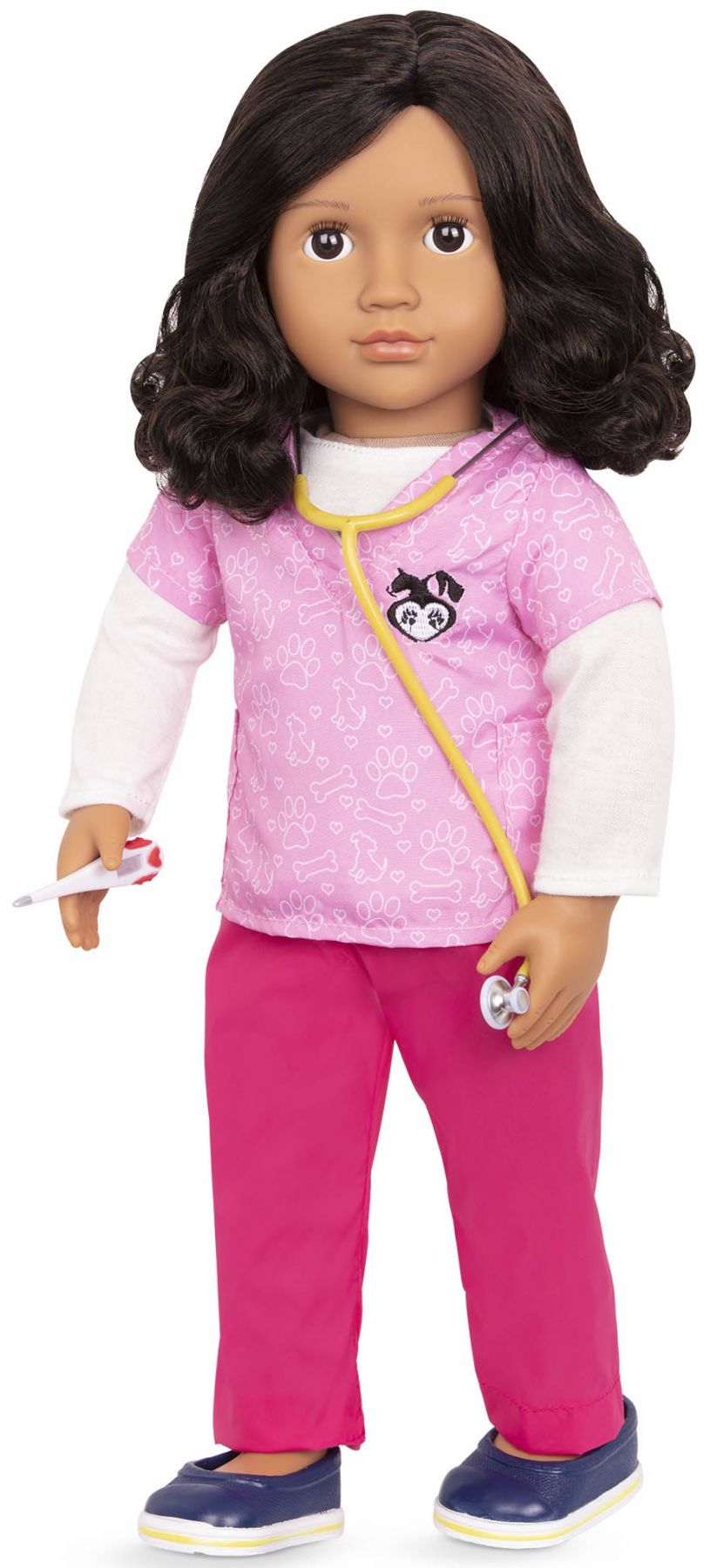 Лялька Our Generation Палома - Ветеринар. У неї гарні каштанове волосся, карі очі й світла шкіра. Вона одягнена в спеціальний одяг і зручні туфлі. У наборі є всі необхідні аксесуари для захоплюючої гри: інструменти ветеринара, стетоскоп, нашийник для цуценят або кошенят, отоскоп з робочим світлом для перевірки вух її пацієнта і багато іншого! Лялька-ветеринар прекрасно доповнить колекцію іграшок від Our Generation, а також відмінно поєднується з наборами аксесуарів бренду.