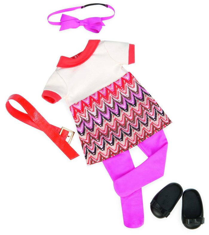 Головне правило у створенні власного оригінального стилю – не боятися експериментів. Набір одягу для ляльок Our Generation 46 см додає яскравих кольорів у палітрі гардеробу улюбленої ляльки, та обов’язково вирізнятиме її серед інших. Колготки та пов’язка для волосся насичено-рожевого кольору, оригінальна сукня з геометричним візерунком та акуратні чорні туфлі – довершений образ для яскравої події або тематичної вечірки. Одяг із комплекту виготовлений із якісного текстилю, тож є цілком безпечним для малюків та приємним на дотик. Окрім того, його можна комбінувати з іншими аксесуарами. Рекомендований вік: 3+.