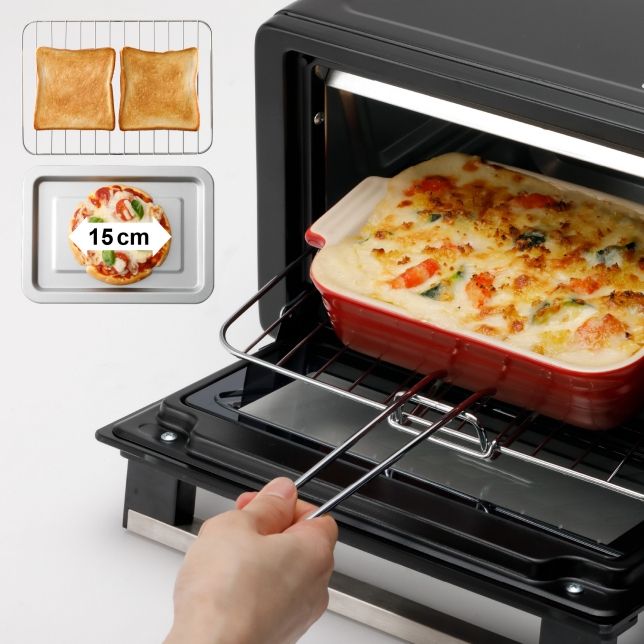 Компактні розміри дозволяють легко розмістити піч на будь-якій кухні. Обсяг 9 літрів ідеально підходить для швидкого приготування страв, наприклад спекти піцу або підсмажити 2 скибочки хліба за один раз. Регулятор температури забезпечує точну настройку в діапазоні від 70 ° C до 230 ° C, що дозволяє готувати різні страви, як в духовці.