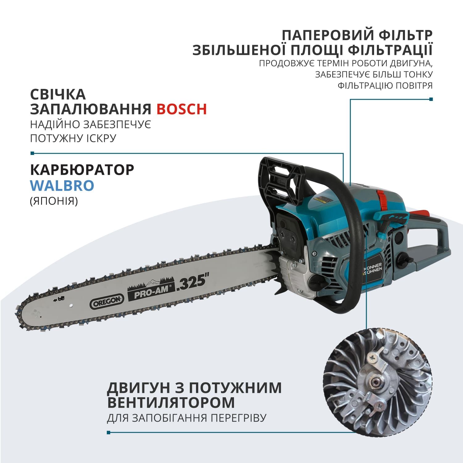 Особливості:Ергономічна рукоятка, Антивібраційна система, інерційне гальмо, співвідношення бензину та масла: 40:1