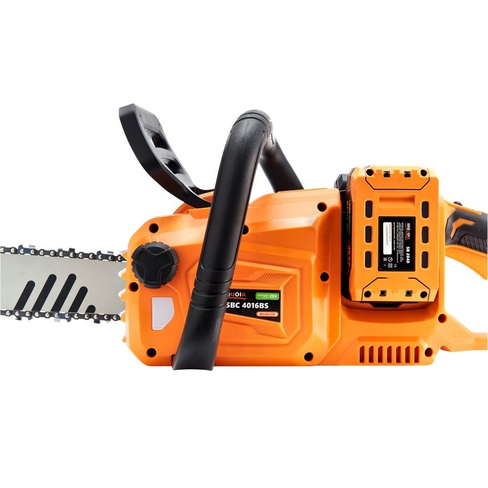 Акумуляторна ланцюгова пила SEQUOIA SBC4016BS-E2W працює від двох акумуляторів 20 В (сумарно 40 В) та оснащена безщітковим двигуном і шиною 40 см з кроком ланцюга 3/8". Швидкість ланцюга до 25 м/с у турборежимі забезпечує впевнений різ деревини середньої та високої твердості. Електронна панель дозволяє обирати між економним, автоматичним та турборежимом, а індикатори показують рівень заряду. Система SDS спрощує натяг ланцюга без інструментів, а комплект включає два акумулятори 4 А·год та подвійний зарядний пристрій. Вага 3,9 кг робить інструмент зручним для тривалої роботи.
