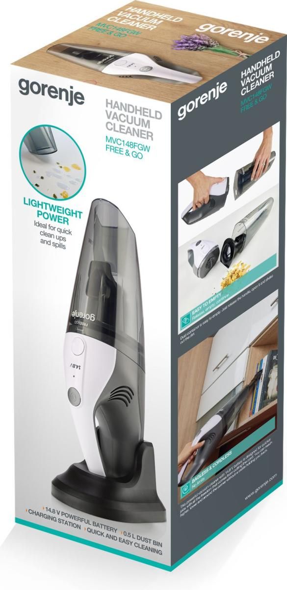 Пилосос Gorenje MVC148FGW належить до ручних акумуляторних моделей для сухого прибирання з контейнером об’ємом 0,5 л. Оснащений Li-Ion акумулятором 14,8 В, що дозволяє працювати автономно без підключення до мережі. Використовується для швидкого очищення невеликих поверхонь і локальних забруднень. Компактний формат зручний для прибирання в автомобілі, на меблях і полицях.