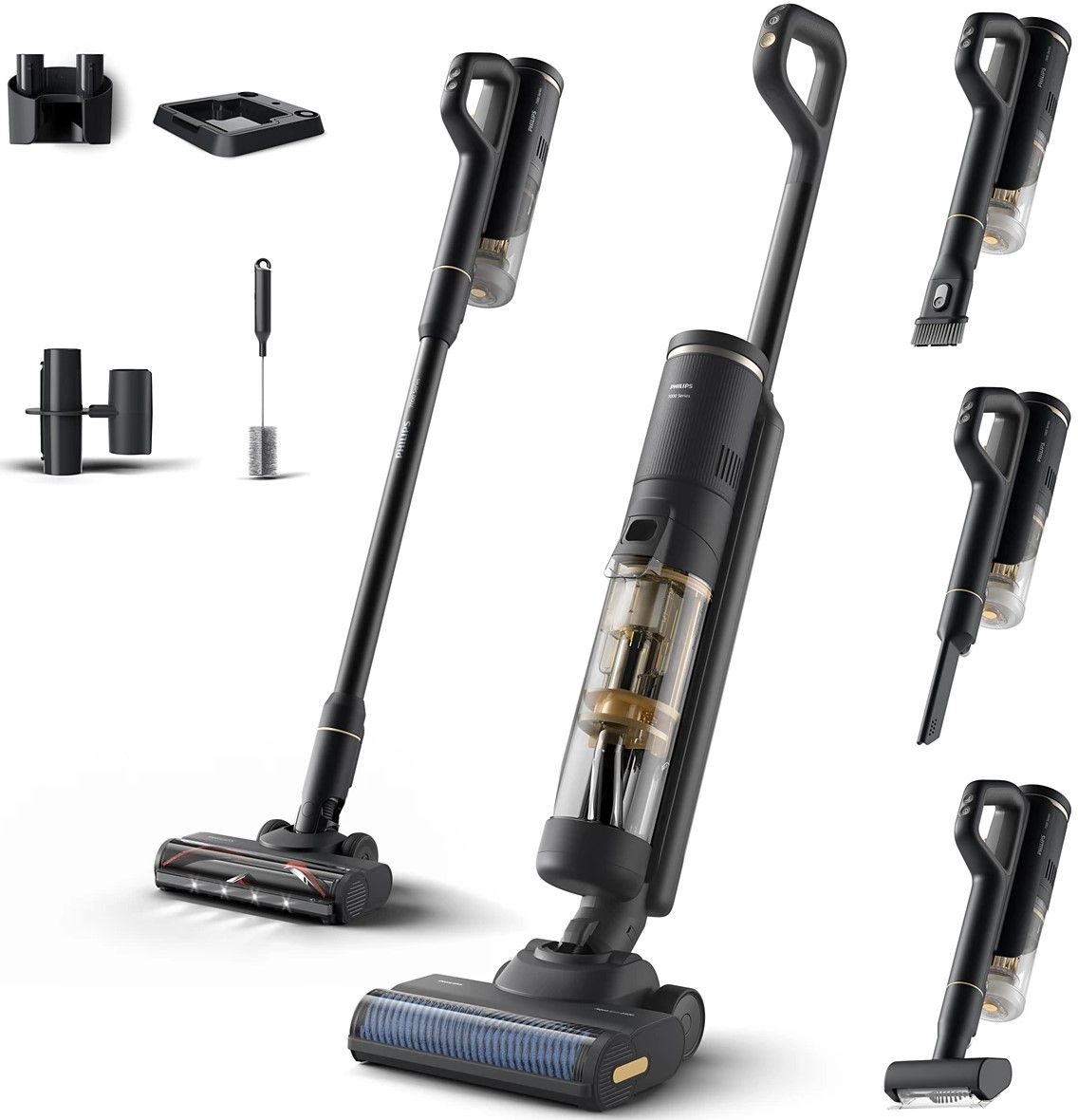 Philips AquaTrio — це багатофункціональний бездротовий пилосос 3-в-1 для сухого, вологого та ручного прибирання. Оснащений потужними щітками AquaSpin зі швидкістю 2500 об/хв, інтелектуальними режимами роботи, LED-підсвіткою для виявлення пилу, гнучкою конструкцією для прибирання під меблями та автоматичною системою очищення без потреби ручного миття. Ідеально підходить для щоденного догляду за підлогою, зокрема в оселях із домашніми тваринами.