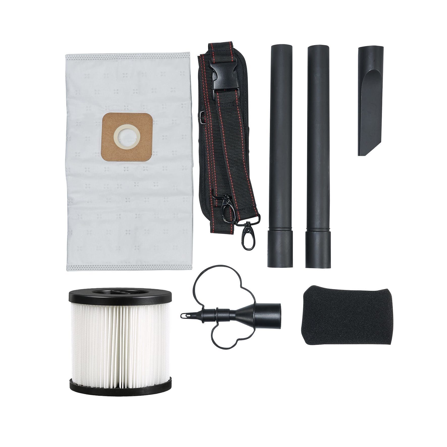 Комплектація:Насадки, поролоновий фільтр, акумулятор і зарядний пристрій в комплект поставки не входять, гофрований фільтр, наплічний ремінь, пилосос, флісовий фільтр-мішок, 2 всмоктувальні трубки, адаптер для надування, всмоктувальний шланг