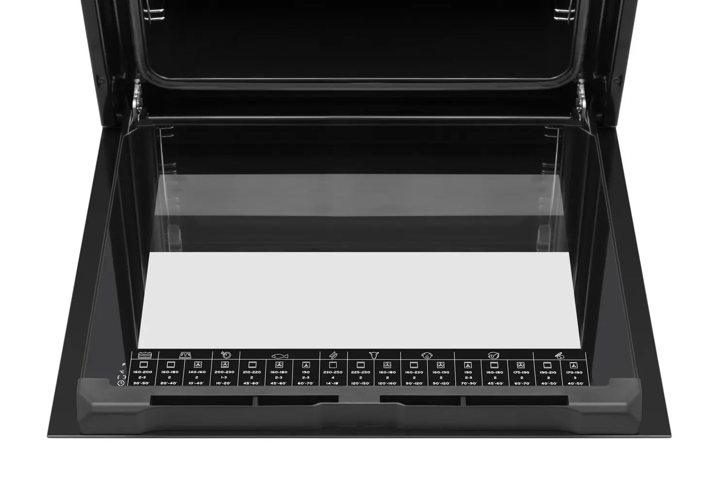 Особливості:знімні дверцята, висувна шухляда для посуду на роликах, рецепти на внутрішньому склі дверцят, час нагрівання до 180°C: 5.5 хв, 6 рівнів встановлення дека, максимальна температура зовнішнього скла дверцят духової шафи: 70 °C