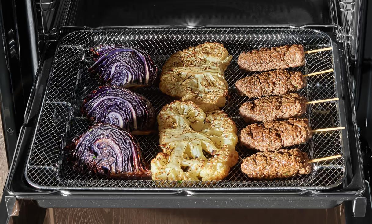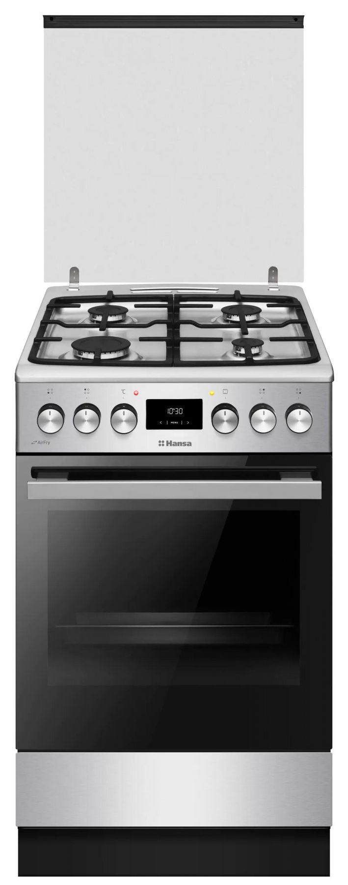 Комбінована плита Hansa FCMX583291 поєднує електричну духовку об’ємом 65 л та газову варильну поверхню з чавунними решітками. Вона оснащена вісьмома режимами приготування, включаючи гриль і функцію швидкого розігріву, що дозволяє готувати страви швидше. Каталітична система очищення спрощує догляд за духовкою.